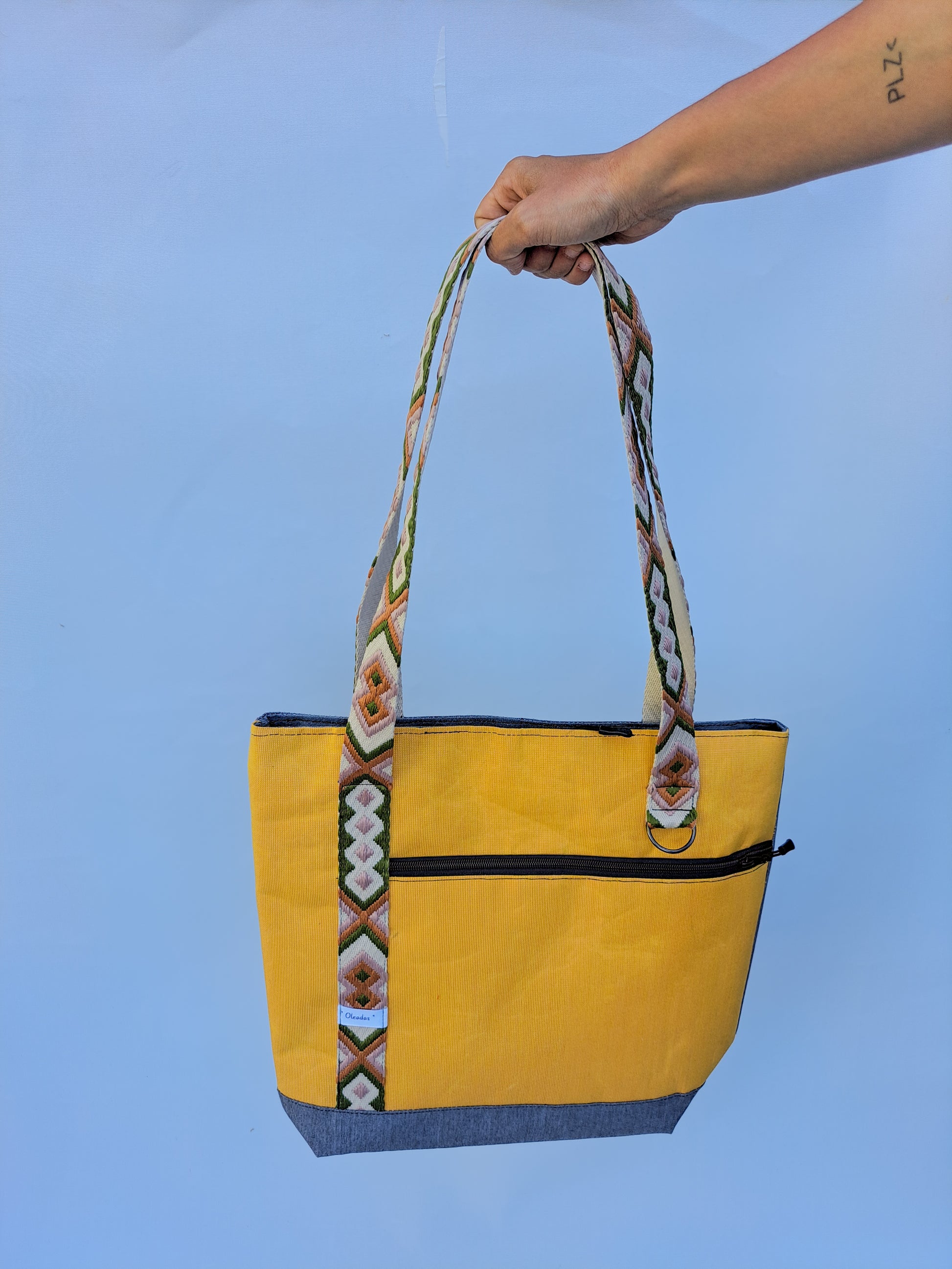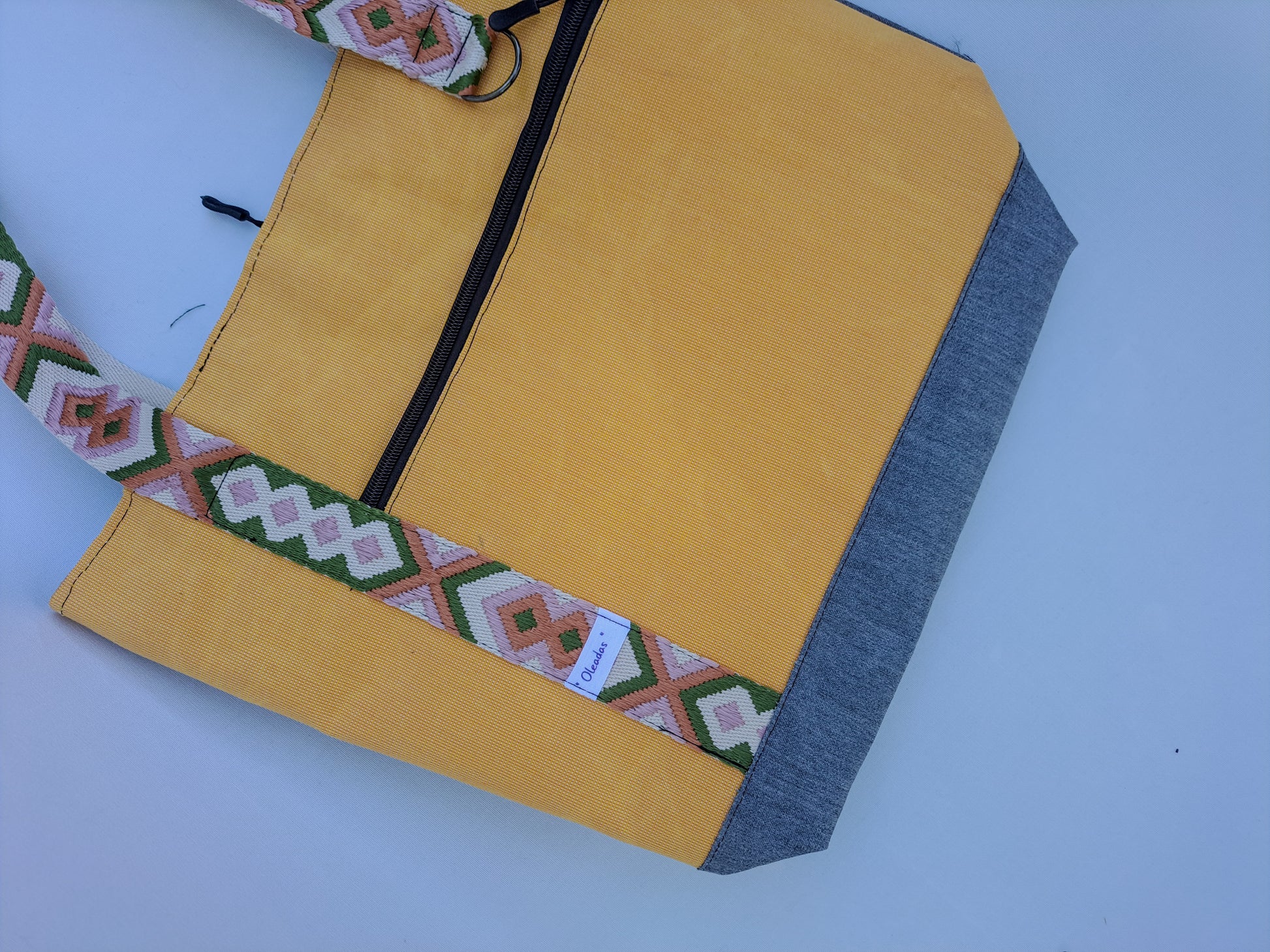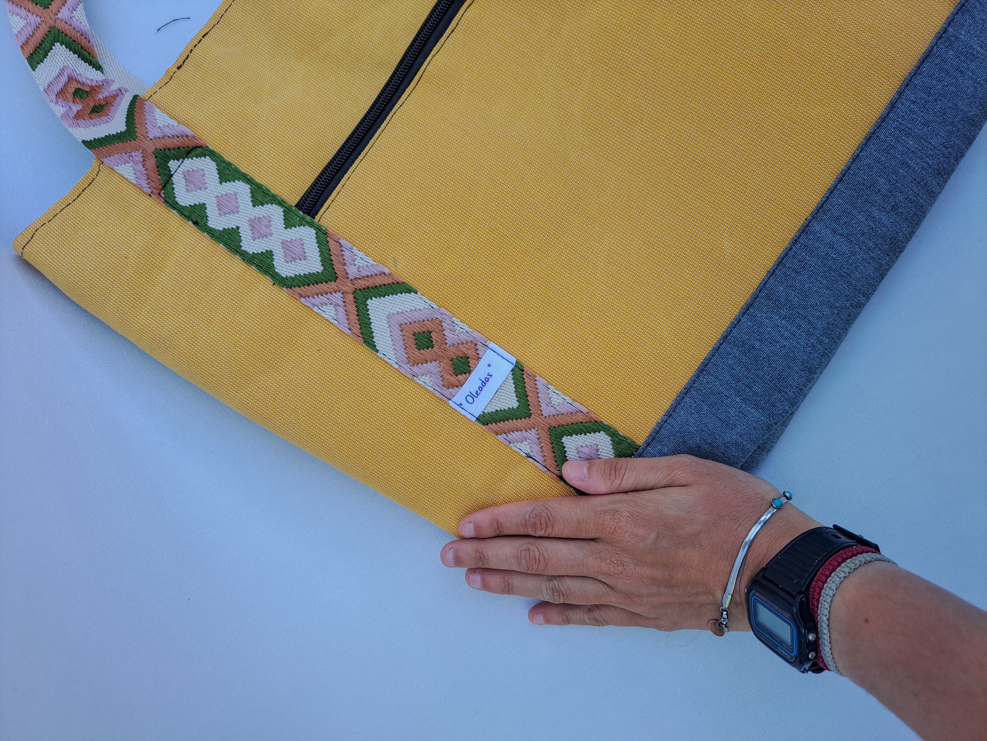 These bags were born in 2025, in the heart of our small workshop. Each one is unique, with reclaimed fabrics, sturdy linings, and colorful handles that remind us of summer markets, sunset strolls, or a train ride with friends.